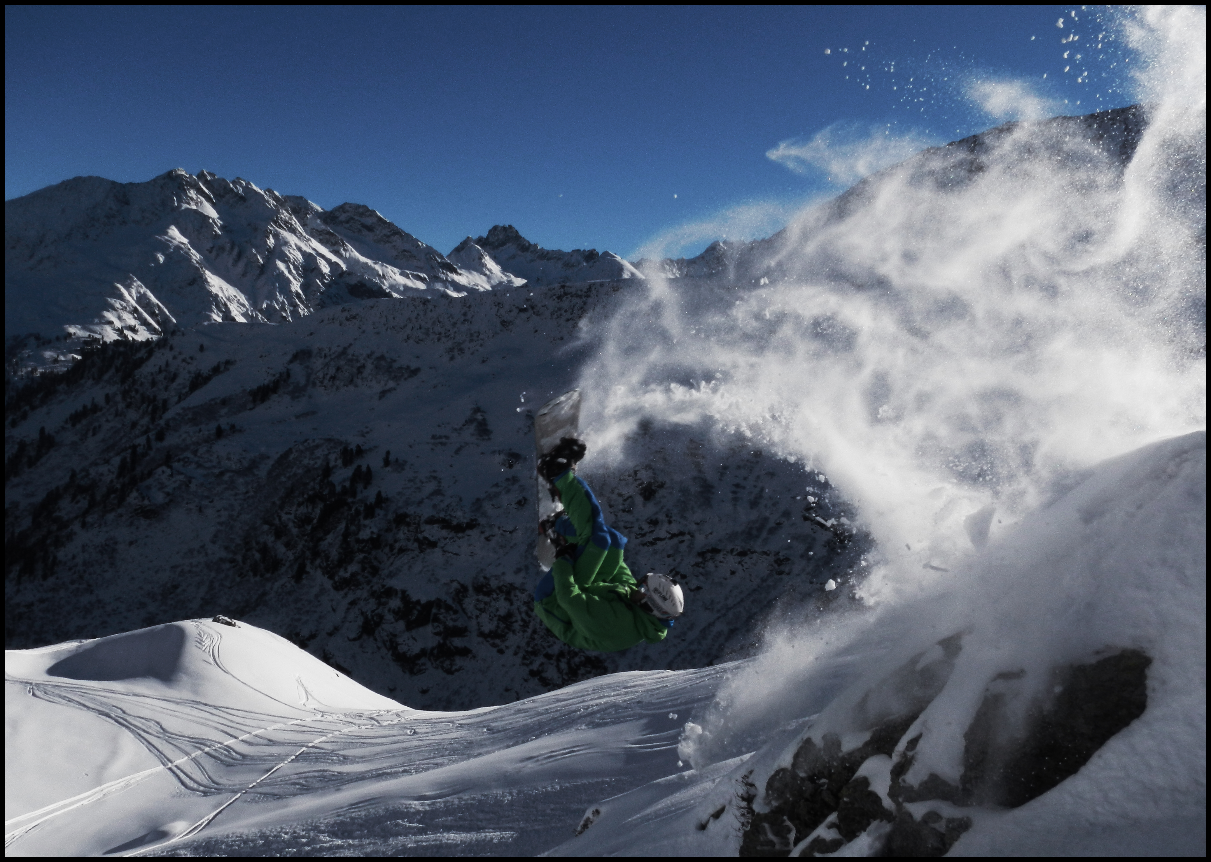 Yesterday I drove a comp in Hochfügen which I won 2 years ago. It had snowed 10 cm but below the snow was hard. I rode with my super lightweight Nitro Ultimate. A good board but not made for large cliffs with icy landings. The day before the comp I broke the top layer because of a hard landing on ice blocks. In my 2nd cliff broke my board between my bindings. I tried to finish my line, but it ended in a fall and landed close to a rock.